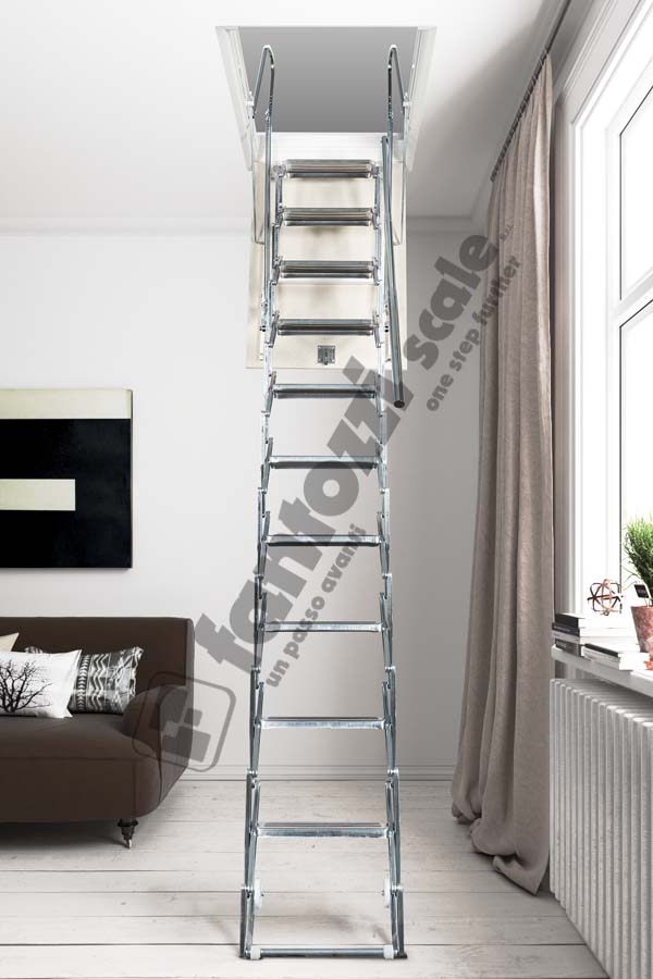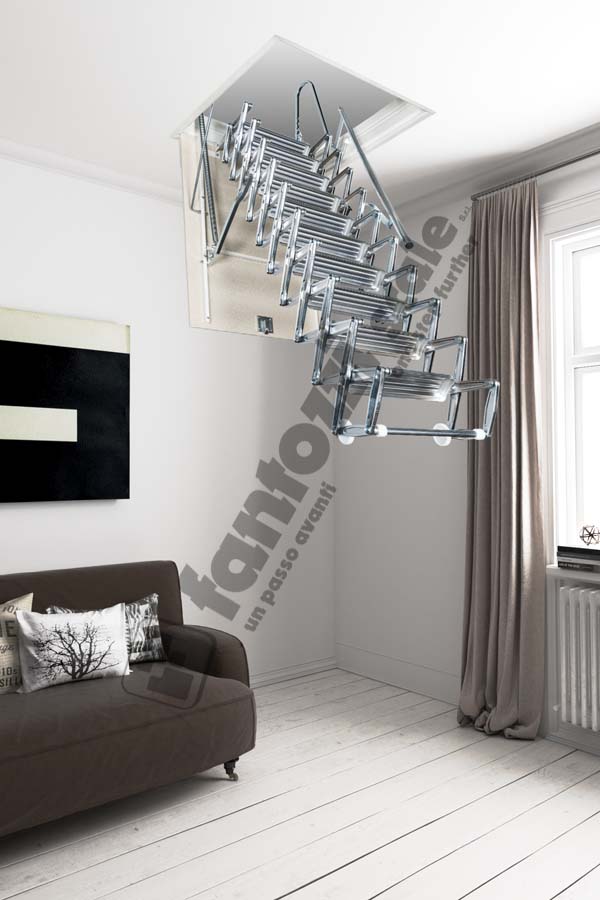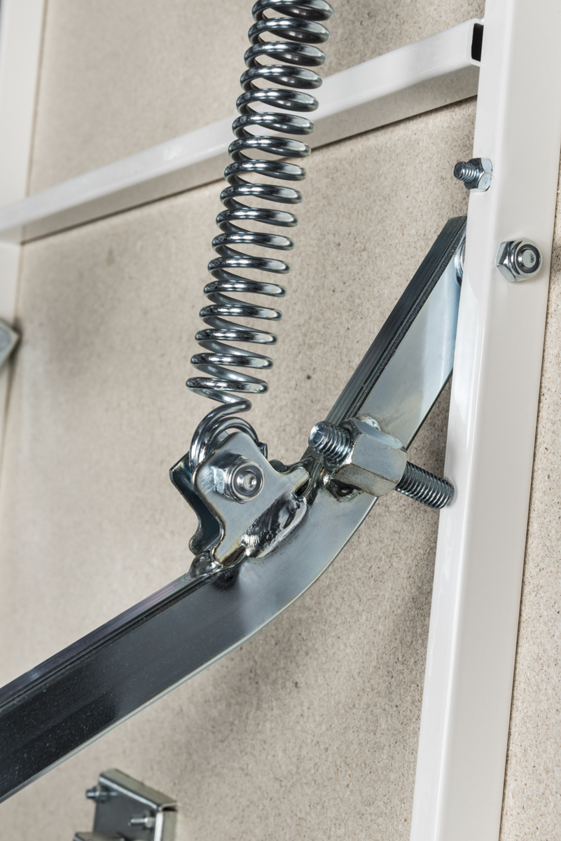 Scherentreppe aus gepresstem Stahl mit weißem Kastenrahmen, Lukendeckel aus hochwertiger Spanplatte aus roher Pappel (16 mm dick, zertifizierte sehr niedrige Formaldehyd-Emission, Klasse E1) komplett mit: