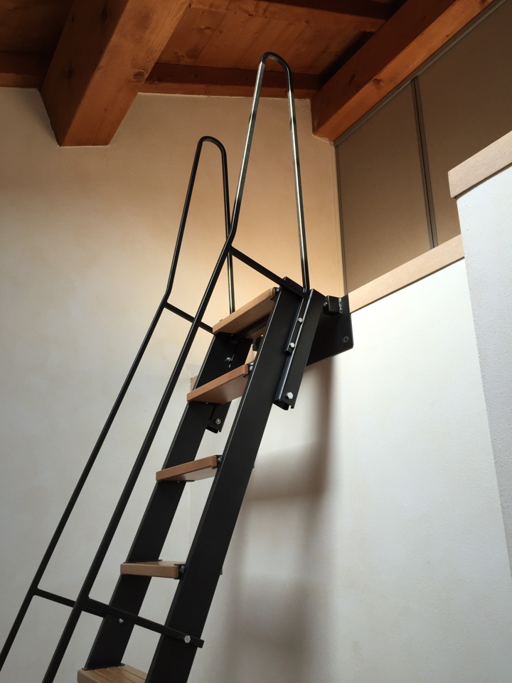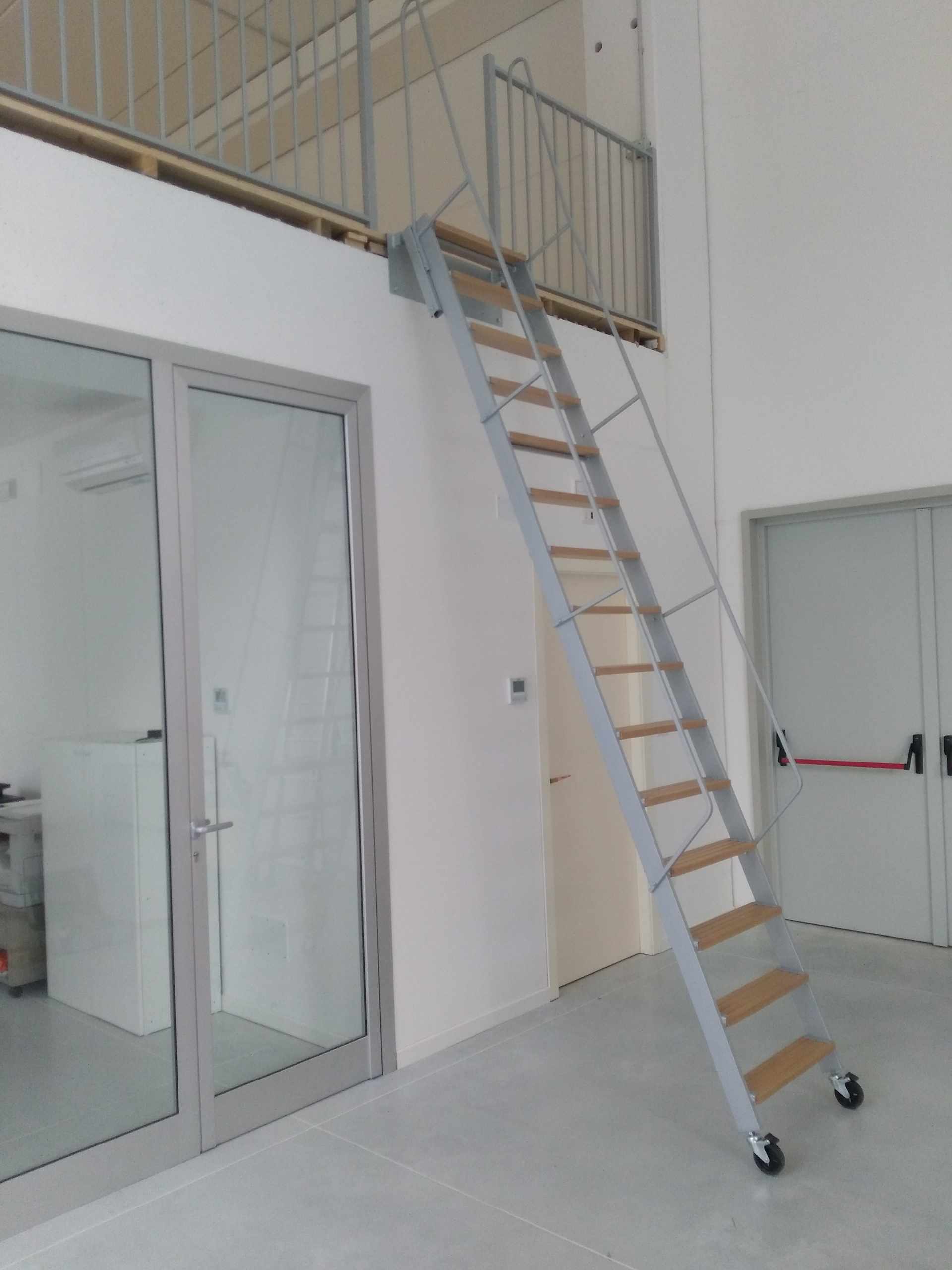 Escala de rampa de estructura rígida para acceso altillo con tres 1,5 mm de espesor, pintado completo, pasos de chapa de espesor de 1,2 mm.