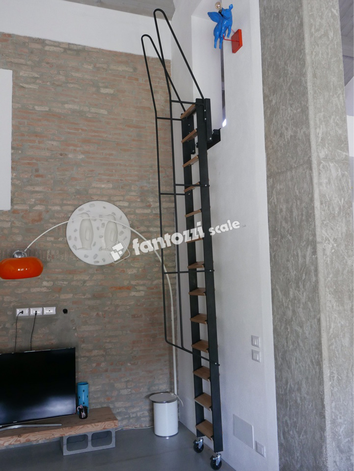Estructura de hierro pintado, con peldaños de hierro (versión básica) o madera (versión elegant).